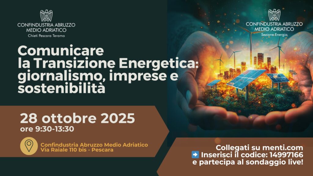 Pescara, 28 ottobre 2025 – Si è svolto oggi nella sede di Confindustria Abruzzo Medio Adriatico a Pescara, il corso di formazione “Comunicare la Transizione Energetica: giornalismo, imprese e sostenibilità”, promosso dalla Sezione Energia di Confindustria Abruzzo Medio Adriatico e da Confindustria Energia, in collaborazione con l’Ordine dei Giornalisti d’Abruzzo, il CERVAS – Centro di Ricerca per la Valutazione e lo Sviluppo Socio-Economico dell’Università “G. d’Annunzio” di Chieti-Pescara e con la partecipazione di esperti e rappresentanti del mondo accademico, industriale e della comunicazione.